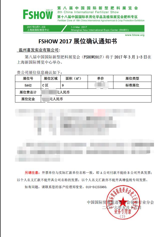 參展通知-溫州喜發(fā)實業(yè)公司將參加2017年度中國國際農(nóng)化展